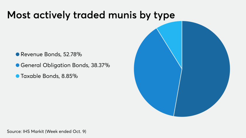 The most active bond types traded this week were revenue bonds, followed by GOs and taxable, according to IHS Markit said.
